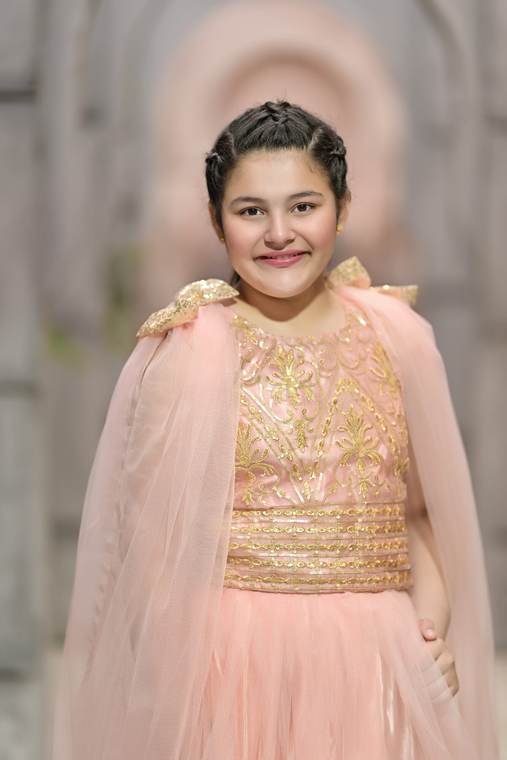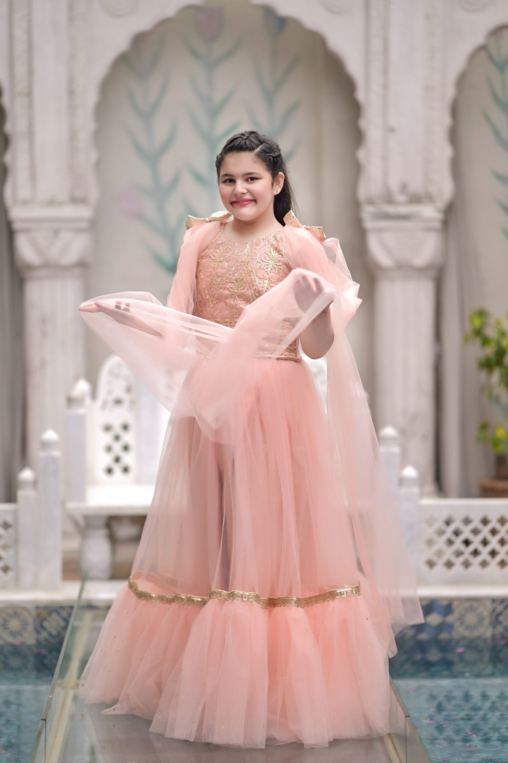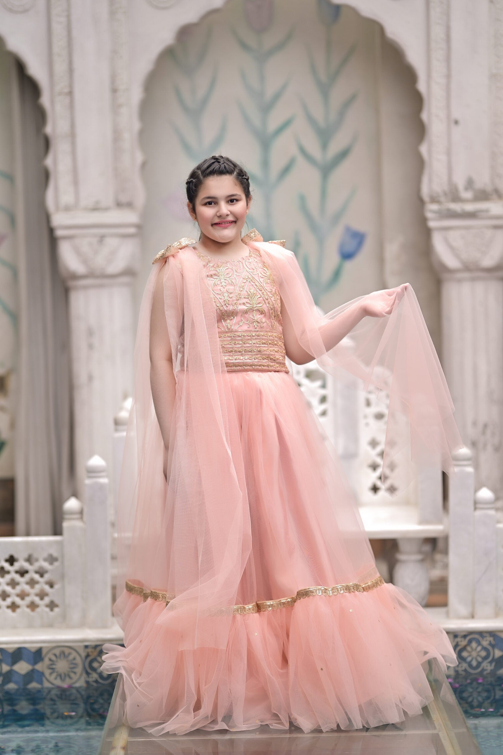 To complete the look, a 3D bow sits at the waist, acting as a focal point with its perfectly crafted design. The bow, made with attention to detail, brings a playful yet sophisticated touch to the frock, balancing the ornate floral elements with its clean and graceful lines.