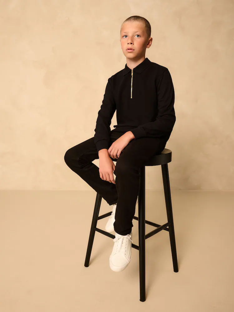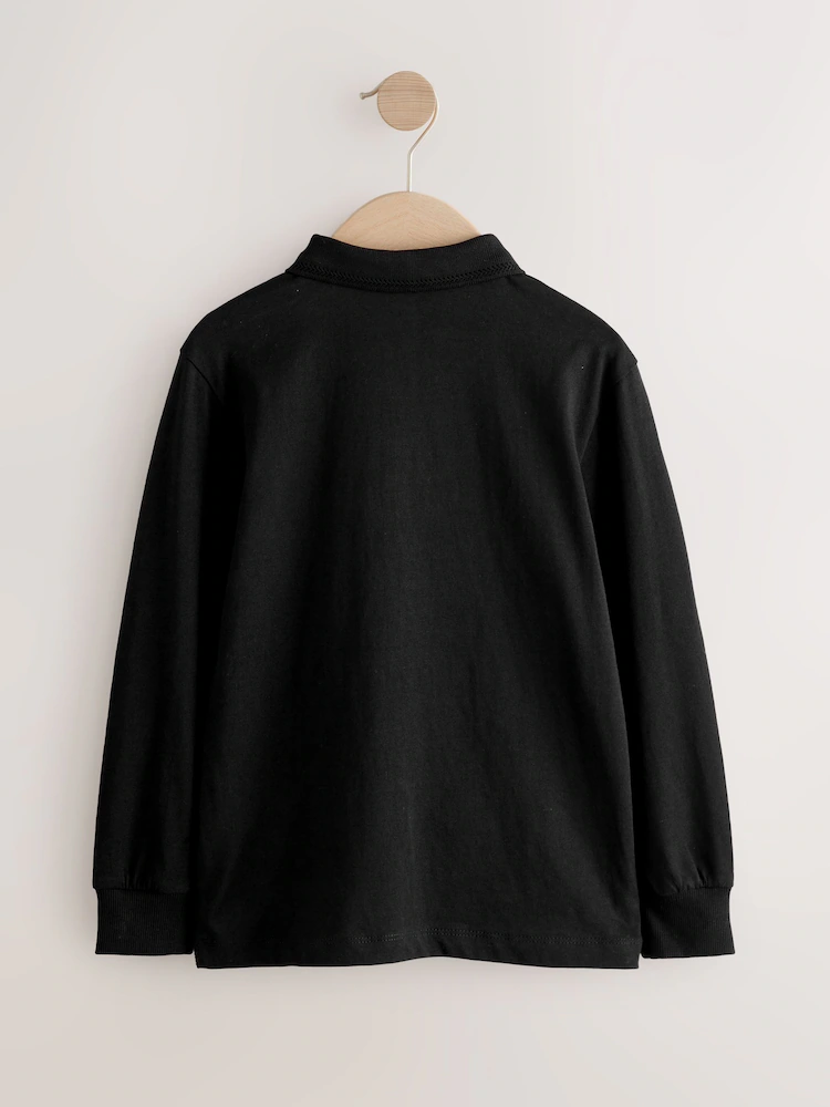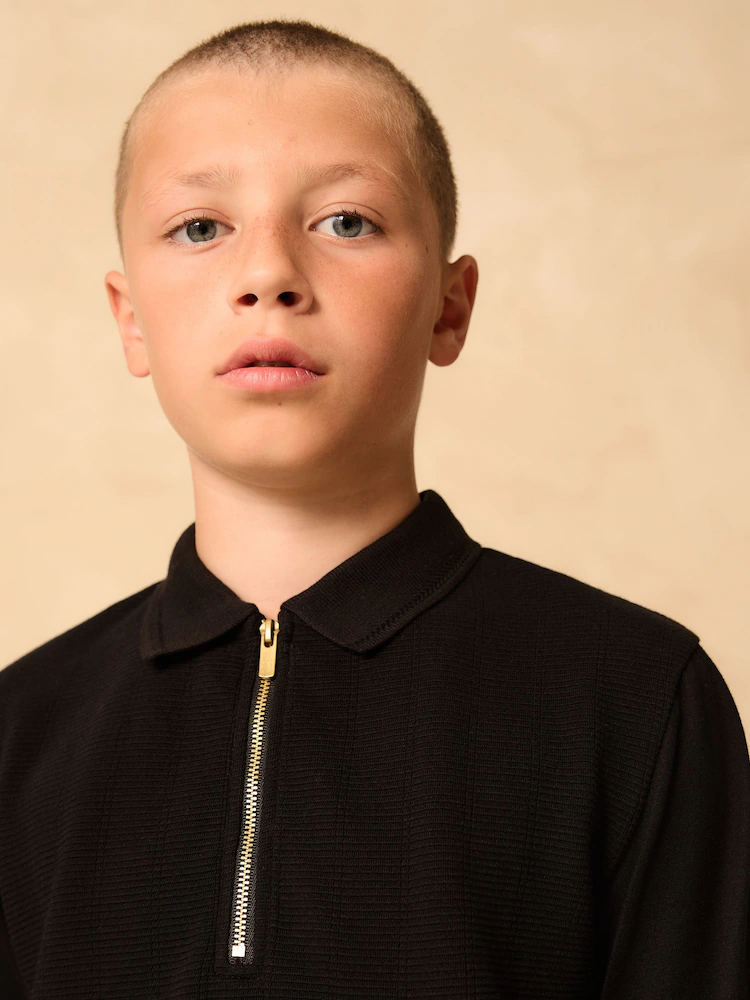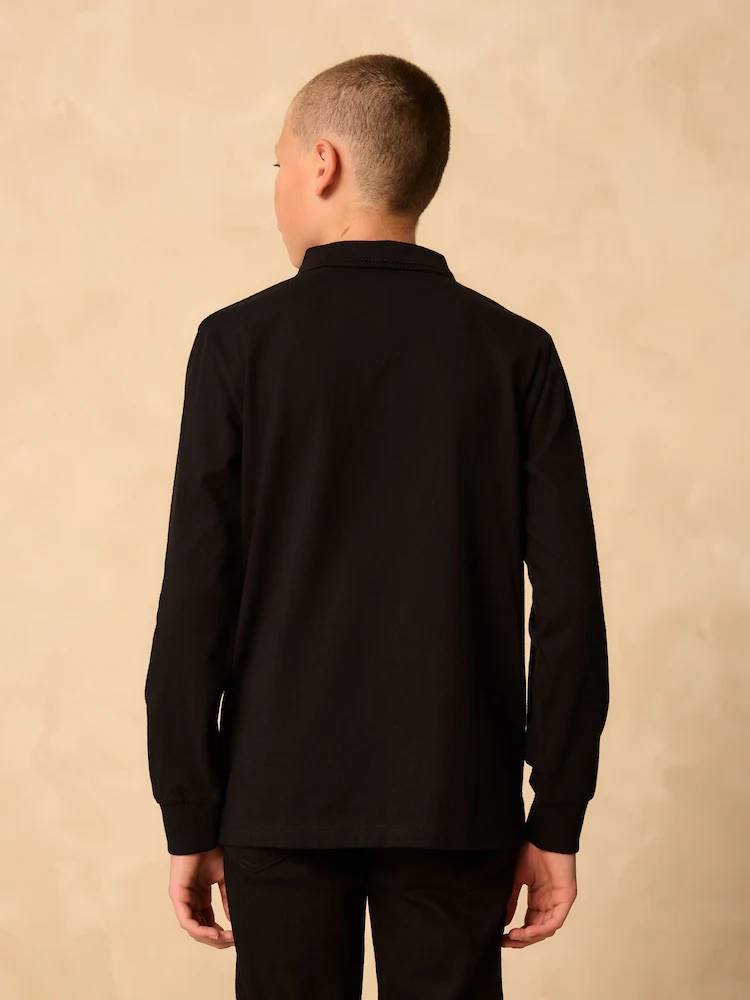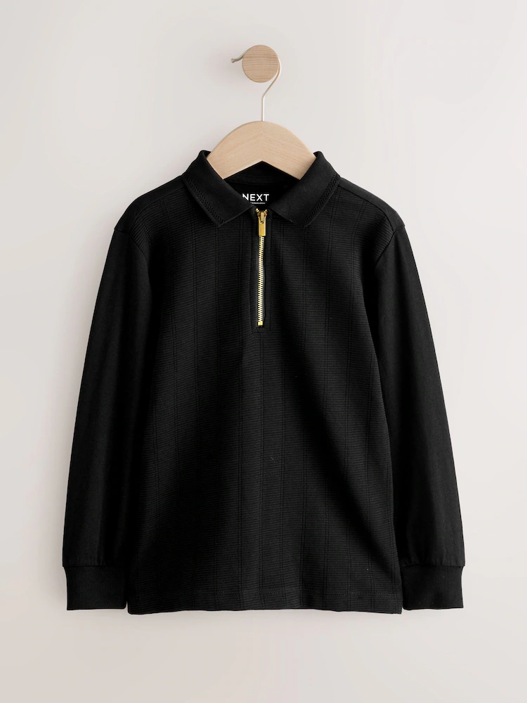 Black Zip Neck Textured Long Sleeve Polo Shirt (3-16yrs)