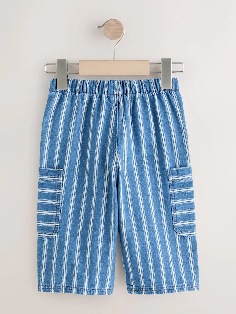 Mid Blue Stripe Wide Leg Pull On Cargo 100% Cotton Jeans (3mths-7yrs) | 100% Cotton