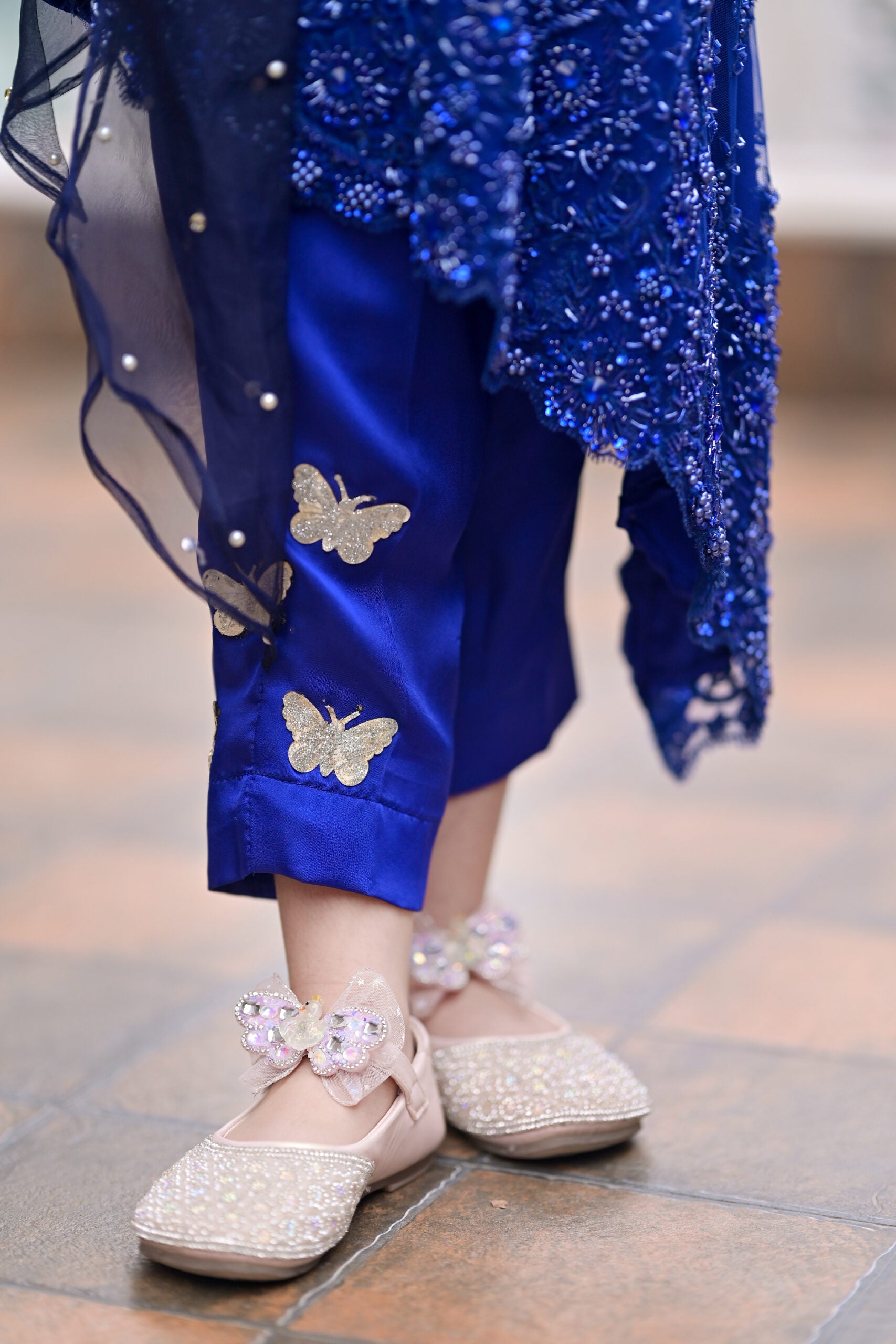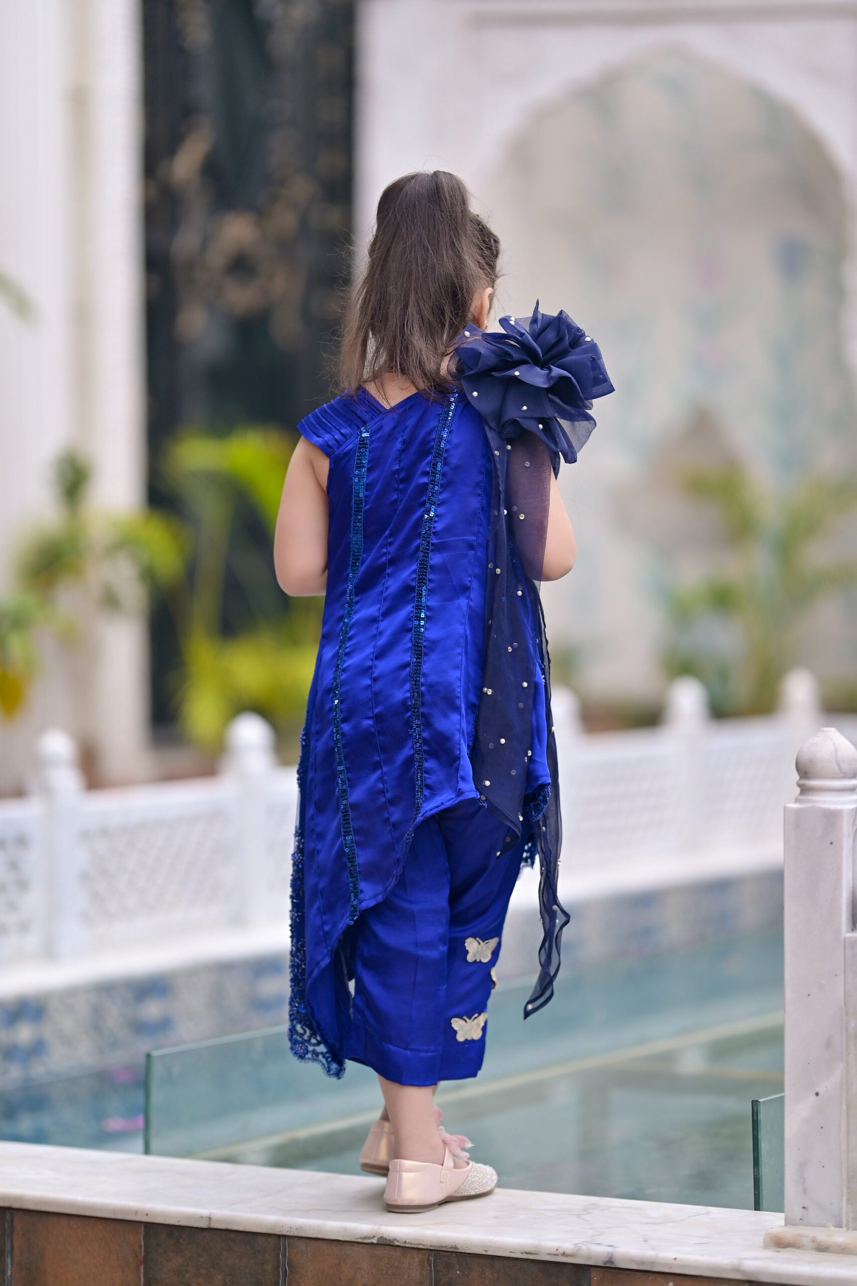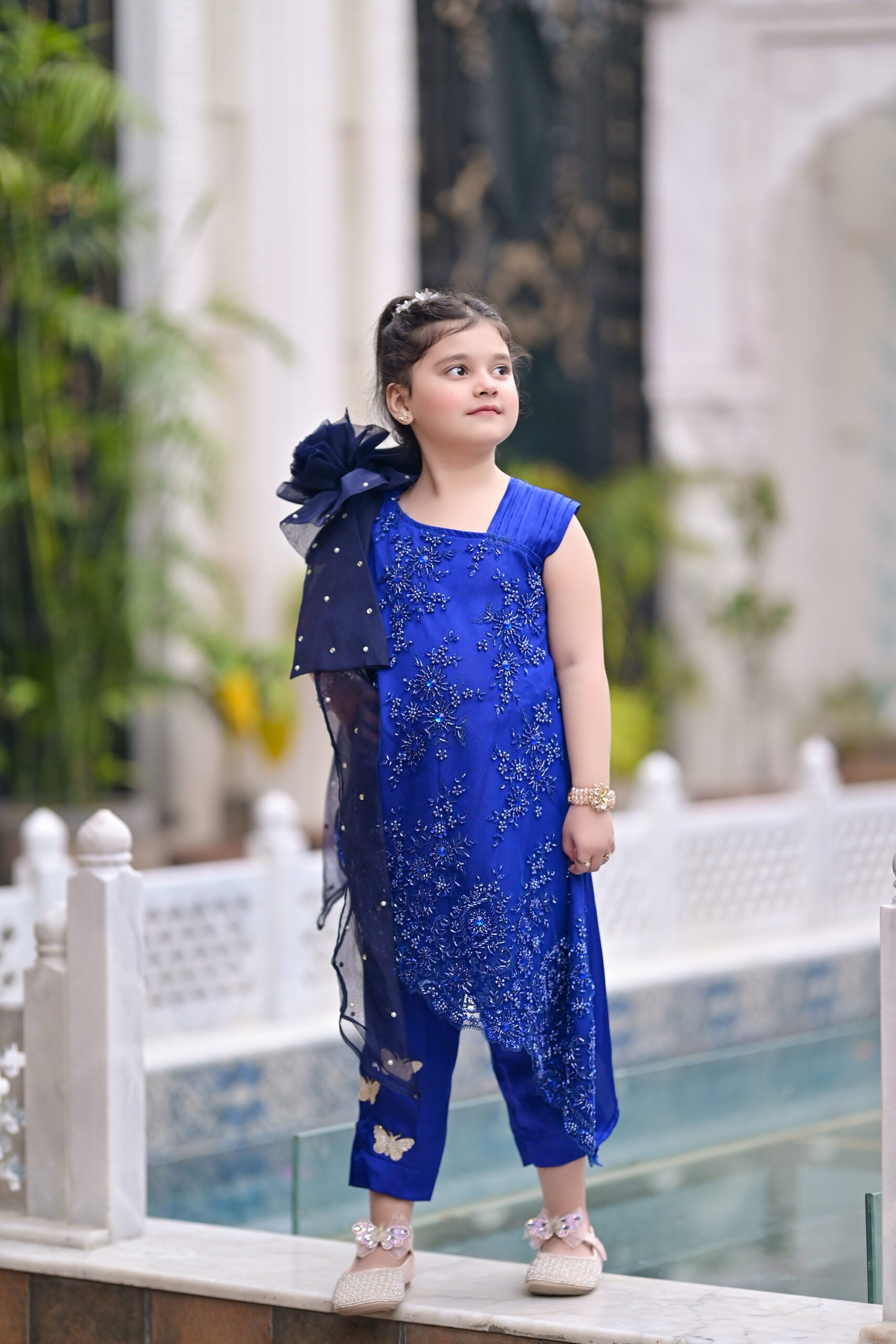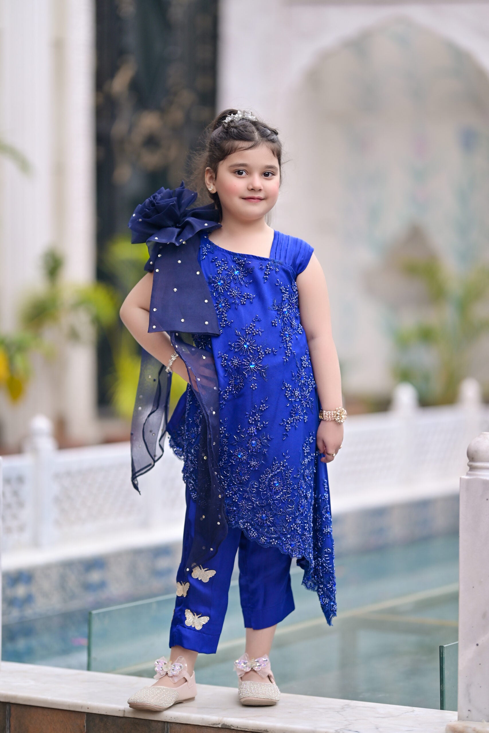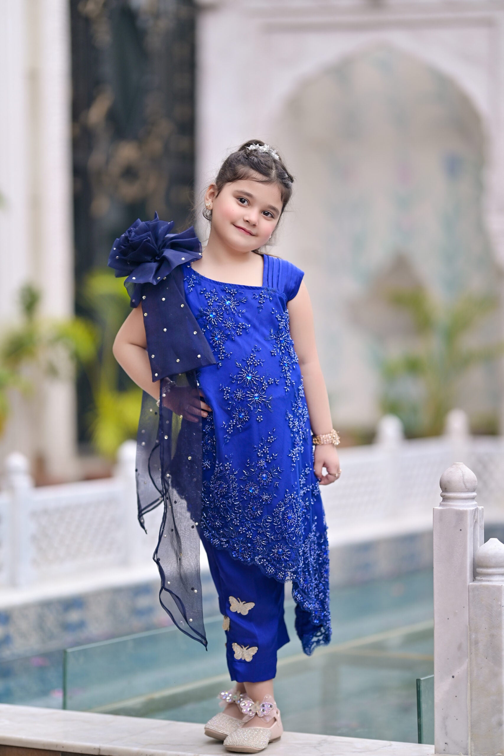 To complete the look, a 3D bow sits at the waist, acting as a focal point with its perfectly crafted design. The bow, made with attention to detail, brings a playful yet sophisticated touch to the frock, balancing the ornate floral elements with its clean and graceful lines.